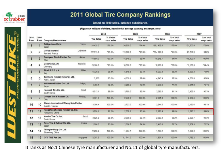 ZC Rubber, listed as No. 11 in the latest Global Tire Company ranking (see below) will ship 10.5 million truck/bus radial tyres and 18.5 million passenger/SUV Tyres in 2010. The sales revenue reached USD2.36 billion in year 2009 with a full range of premium tyre and rubber products supported by 50 years experience and modern industry technology.